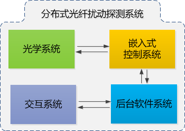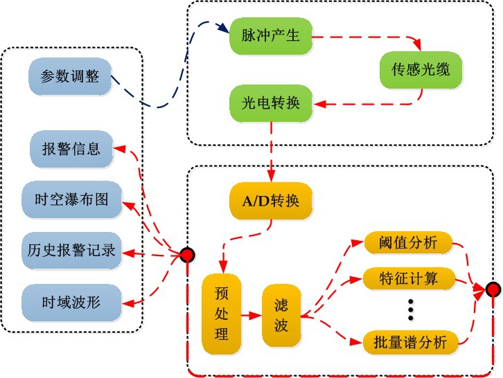 光學(xué)系統(tǒng)產(chǎn)生極窄線寬、功率適當(dāng)?shù)奶綔y脈沖,將探測脈沖注入傳感光纖并同時接收傳感光纖中返回的瑞利后向散射光,進(jìn)行光電轉(zhuǎn)換,提供原始的擾動傳感信號。嵌入式控制系統(tǒng)和后臺軟件系統(tǒng)對傳感數(shù)據(jù)進(jìn)行存儲、處理、計算、傳輸、交互。嵌入式控制系統(tǒng)通過數(shù)據(jù)采集設(shè)備將光探測器輸出的模擬擾動傳感信號轉(zhuǎn)換為數(shù)字信號,交付后臺軟件系統(tǒng)進(jìn)行實時處理。后臺軟件系統(tǒng)讀取傳感數(shù)據(jù)后,進(jìn)行預(yù)處理、濾波、批量 FFT 分析、特征量計算、閾值分析等,提供擾動數(shù)據(jù)的處理結(jié)果。交互系統(tǒng)將后臺軟件系統(tǒng)的處理結(jié)果實時顯示給用戶查看,包括報警信息、擾動曲線、時域波形、時空瀑布圖、調(diào)閱歷史報警記錄、查看歷史波形等功能,并可根據(jù)用戶的輸入,對系統(tǒng)的空間分辨率、脈沖重復(fù)頻率、探測脈沖寬度等參數(shù)進(jìn)行適當(dāng)調(diào)整。
