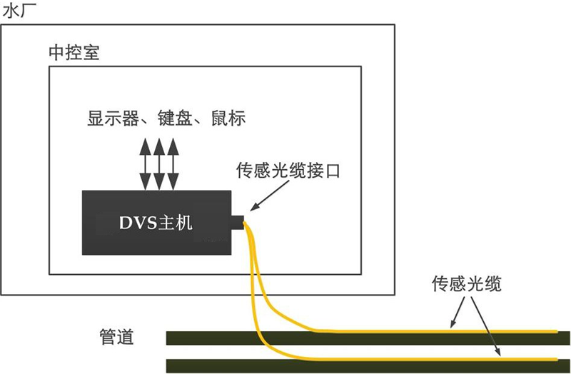 在水廠的中控室(或類似設(shè)備間)內(nèi)放置 DVS 主機,并連接顯示器、鍵盤、鼠標(biāo), 供給 220V AC 市電,開機使其正常運行。將沿管壁貼敷的傳感光纜從地下管道處引入水廠內(nèi)、導(dǎo)入中控室中,選取光纜中的一芯熔接 FC/APC 跳線后,插入 DVS 主機的傳感光纜接口。運行 DVS 泄漏在線監(jiān)測軟件,系統(tǒng)正常運行,可實時在線監(jiān)測管線各處的泄漏情況。
