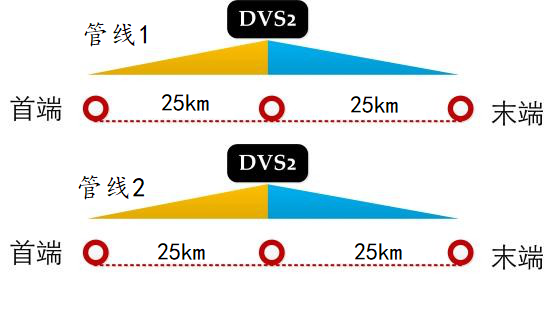 具體,可采用兩套雙通道 DVS 系統(tǒng)從中間向兩邊輻射實現(xiàn) 50km 的雙管線全覆蓋監(jiān)測。為降低系統(tǒng)建設(shè)成本,可將兩條管道全部安裝光纖傳感器,兩套傳感器共用一套DVS系統(tǒng),進(jìn)行分時測量,即同一時間只能監(jiān)測一條管線,管線1和管線2輪流監(jiān)測。