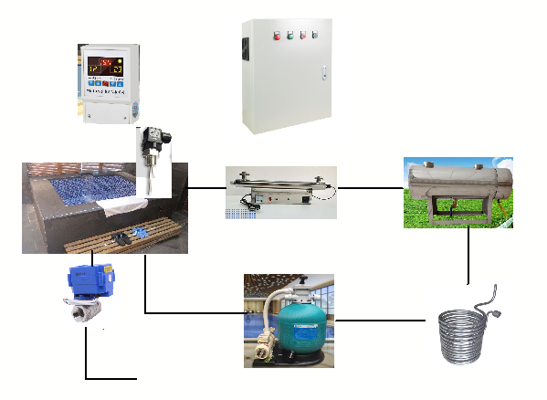 系統(tǒng)由水池、石英砂過濾泵、換熱盤管、管道電熱補(bǔ)償器、紫外殺菌儀、溫度控制儀、成,見下圖:
