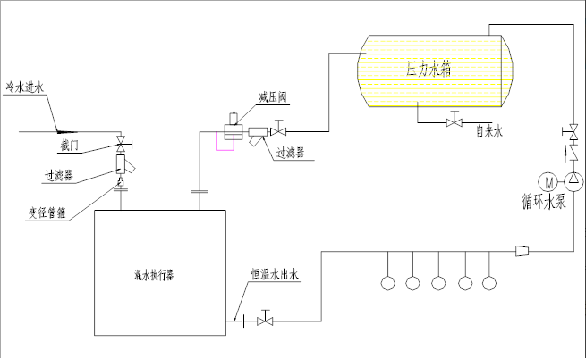 統(tǒng)的浴池?zé)崴到y(tǒng)不論采用何種加熱方式(空氣源熱泵、太陽能、燃?xì)忮仩t、燃油鍋爐、購買熱水等),為了滿足熱水供應(yīng),普遍采用加大儲水箱或提高熱水溫度來解決熱水供應(yīng)問題,由于浴室熱水用量的不確定性,因而造成了能源的浪費(fèi),增大了經(jīng)營者運(yùn)營成本。本公司提出的恒溫循環(huán)供水方法,為用戶解決了上述問題。系統(tǒng)原理圖如下: